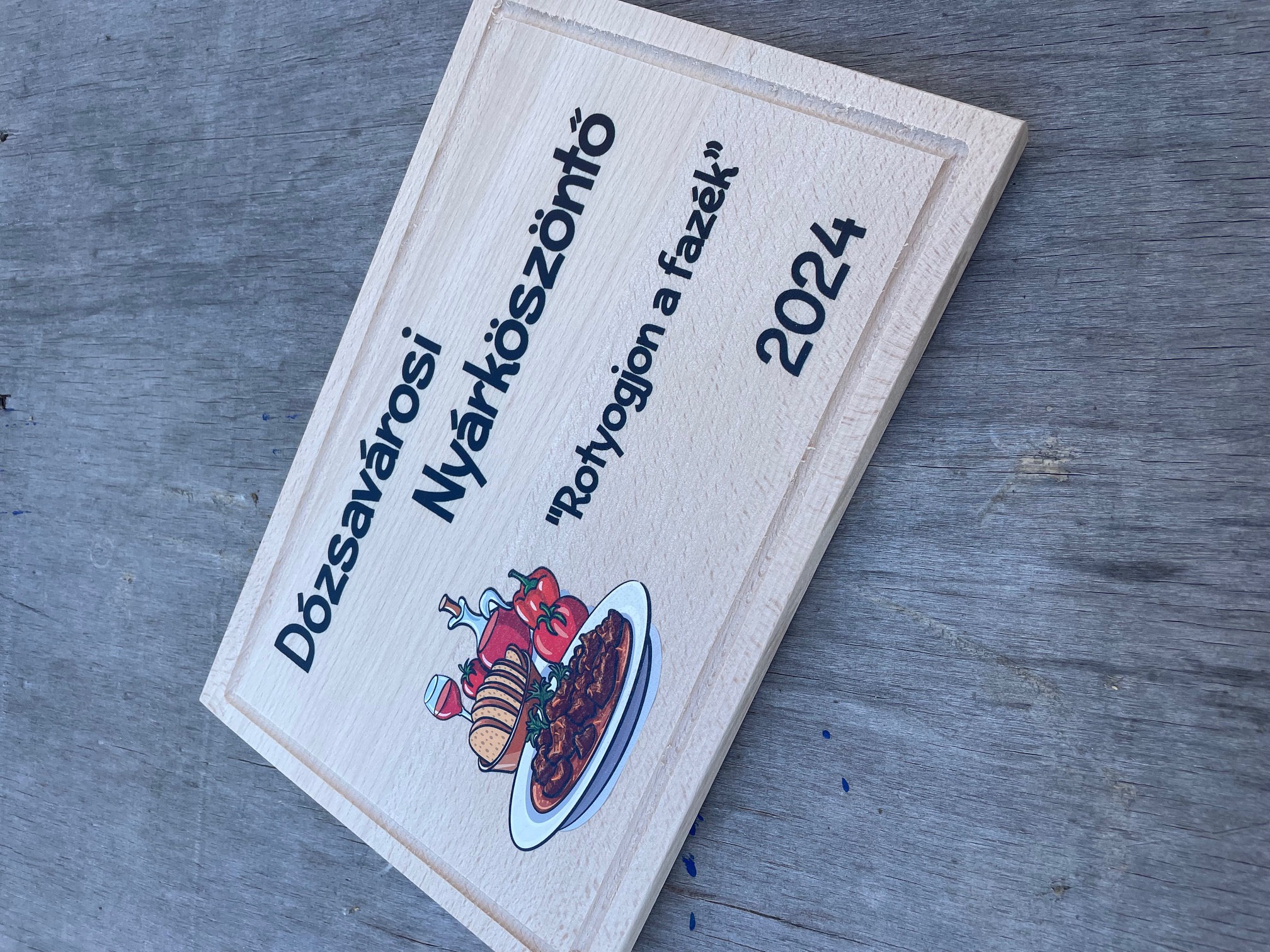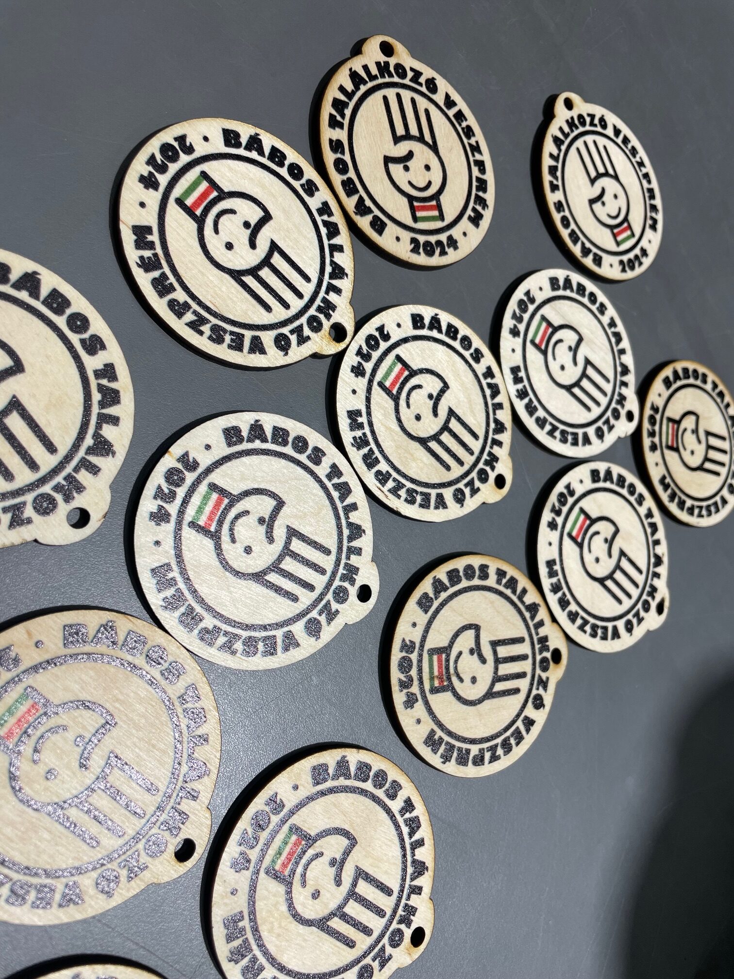 Ennél a három megbízásnál falemezre vagy fából készült tárgyakra kellett nyomtatnunk. A vágódeszkát és a kör alakú alátétet ajándékba készítették megrendelőink a partnereiknek. Az érmeket pedig egy bábos találkozón adták át a résztvevőknek emlékbe.