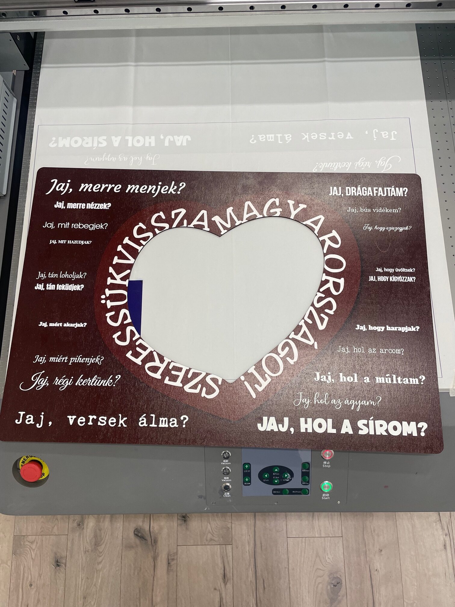 Legújabb gépünk egy nagy formátumú UV-LED nyomtató, mellyel kiváló minőségben tudunk nyomtatni többek között műanyagokra, fémekre, fára, üvegre, plexire akár 15 cm vastagságig.